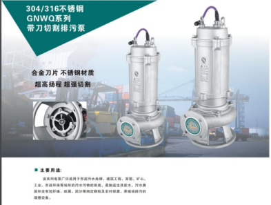 304.316不銹鋼GNWQ系列帶刀切割排污泵。葉輪具有獨(dú)特的螺旋式結(jié)構(gòu)及帶鋒利刀口設(shè)計(jì),在保證永利性能的高效且超過同類產(chǎn)品的同時(shí),兼具卓越的切割能力,能夠保證稻草,棉,布等廢棄物切碎后完全排出,不堵塞。